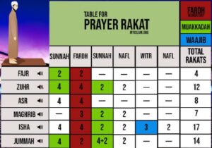 Gabatee kun tokkoon tokkoon salaataatiif baay’ina rakataa gabaabsee ibsa. Isaan kun tokkoon tokkoon isaanii rakaa meeqa akka salaattu akka beektuuf sammuutti qabamuu qabu. Rakaan akka yuunitii ykn marsaa salaataa tokkootti ilaalamuu danda’a.